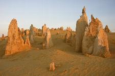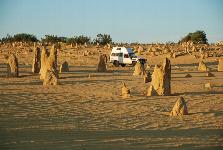 | Sa. 3.5.08 Sonnenaufgang im Nambung NP und weiter bis Port Denison Wir stehen sehr früh auf und fahren, umsichtig nach Kängurus Ausschau haltend, nun zum Sonnenaufgang zu den Pinnacles. Bestimmt hat es hier schon beeindruckendere Sonnenaufgänge gegeben und es ist morgens noch ganz schön frisch, aber es ist trotzdem ein tolles Erlebnis. Zwei Pink Galahs (rosa Kakadu), die auf einem hohen Stein sitzen und sehr zutraulich sind, vertreiben uns nebenbei die Zeit. Wir fahren zum Camp zurück, Frühstücken und schaffen gut die Checkout-Time. Einkaufen und Tanken wird schnell erledigt und wir fahren zum Lake Thetis mit den Stromatholithen. Das sind lebende Gebilde aus Cyanobakterien, die über 1000 Jahre alt sein können. Viel Bewegung ist von ihnen allerdings nicht zu erwarten, so lohnt sich der Abstecher nur für wirklich daran interessierte Naturliebhaber.