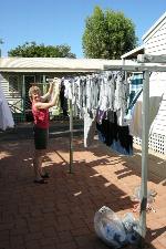 | Fr. 30.5.08 Derby, Camper einräumen Werden morgens von einem Schwarm laut krächzender Little Corellas geweckt. Es war unsere erste Nacht in dem Bushcamper und Petra hat ganz schlecht geschlafen. Der Schlafplatz im Dach ist in der Höhe von der Nasenspitze zur Decke doch sehr knapp und gleicht fast einem Sarg. Ob das die nächsten 3 Wochen gut gehen wird? Muss wohl, denn zusammen unten schlafen ist ausgeschlossen, das wäre nur was für ganz schlanke Heringe. Wir räumen nun den Camper ein und organisieren uns das Innenleben, das dauert fast den halben Tag, aber wir wollen ja nicht andauernd umräumen und bekommen doch recht viel verstaut.