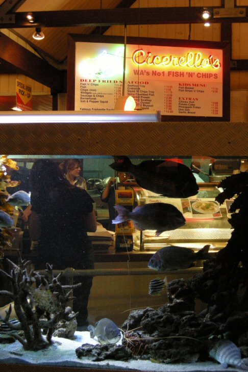 Zurück in Fremantle machen wir zum Sonnenuntergang noch eine kleine Ortsbesichtigung. Der erste Eindruck gefällt uns gut. Im Restaurant Cicerello’s mit dem 22 m langen Aquarium essen wir ganz rustikal fangfrischen Fisch. Fahren dann glücklich in unser Camp und fallen ins Bett. |