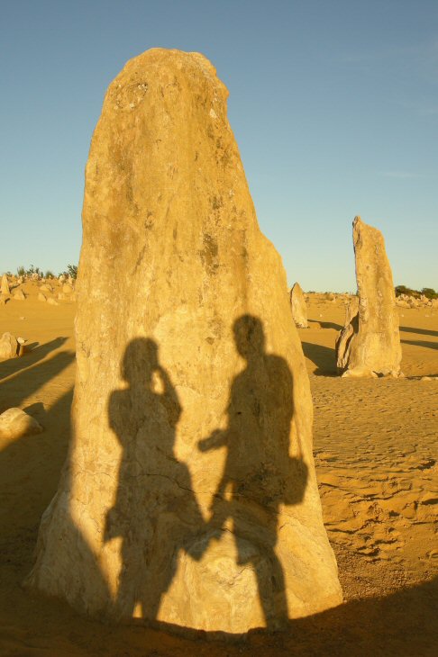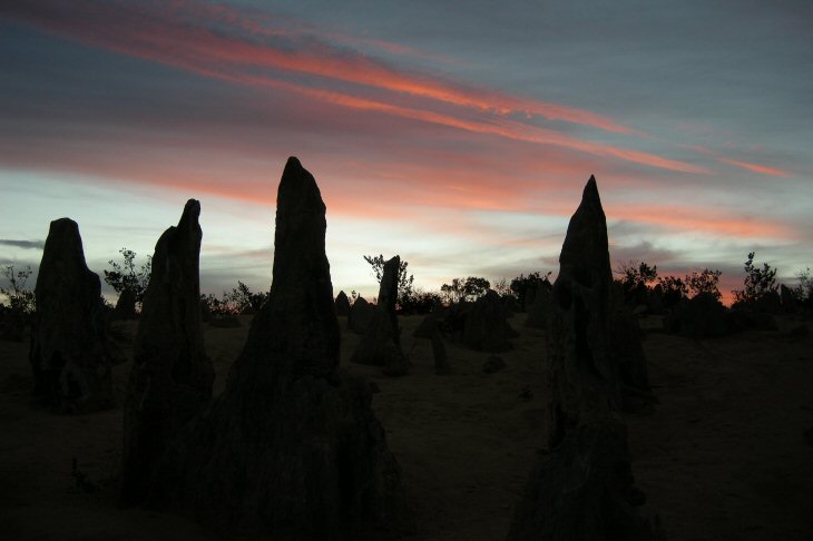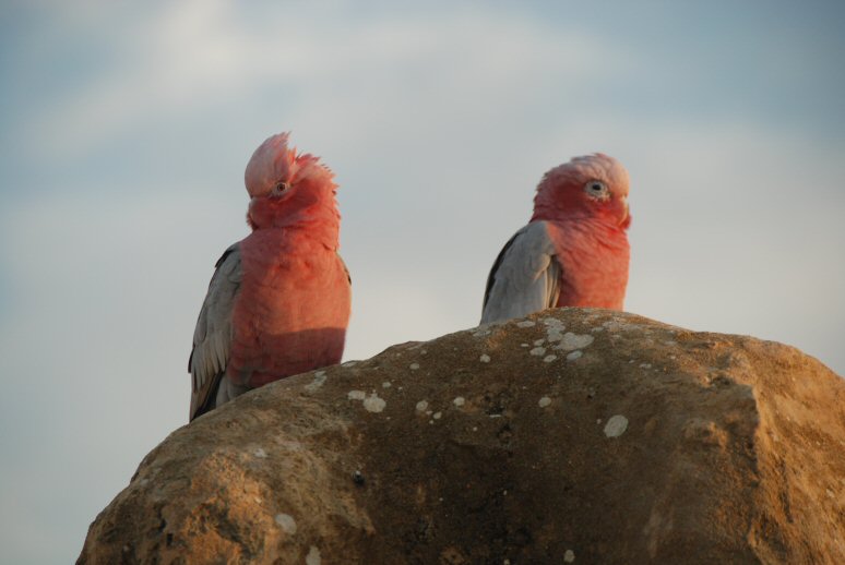 | Sa. 3.5.08 Sonnenaufgang im Nambung NP und weiter bis Port Denison Wir stehen sehr früh auf und fahren, umsichtig nach Kängurus Ausschau haltend, nun zum Sonnenaufgang zu den Pinnacles. Bestimmt hat es hier schon beeindruckendere Sonnenaufgänge gegeben und es ist morgens noch ganz schön frisch, aber es ist trotzdem ein tolles Erlebnis. Zwei Pink Galahs (rosa Kakadu), die auf einem hohen Stein sitzen und sehr zutraulich sind, vertreiben uns nebenbei die Zeit. Wir fahren zum Camp zurück, Frühstücken und schaffen gut die Checkout-Time. Einkaufen und Tanken wird schnell erledigt und wir fahren zum Lake Thetis mit den Stromatholithen. Das sind lebende Gebilde aus Cyanobakterien, die über 1000 Jahre alt sein können. Viel Bewegung ist von ihnen allerdings nicht zu erwarten, so lohnt sich der Abstecher nur für wirklich daran interessierte Naturliebhaber.