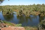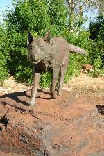 Sa. 24.5.08 Karratha bis Point Samson Zuerst schauen wir uns den Ort Dampier an und machen auch einen Halt am Ortseingang bei der Bronzestatue des Red Dogs, dem wohl bekanntesten Hund Westaustraliens. Dann frönen wir ausgiebig unserem Hobby Geocaching; der sehr nachdenklich stimmende, virtuelle „Massaker-Cache“ auf der Burrup Peninsula steht auf dem Programm. Der nächste einfache Cache gestaltet sich sehr schwierig und der Miaree Pool Cache ist auch nicht so ohne. Erst überlegen wir auf welcher Seite der Straße, dann auf welcher Seite vom Fluss er liegen könnte. Axels Gedächtnis funktioniert in dem Fall gut (Google Earth hilft), aber wir müssen in der Mittagshitze über 700 m hinlaufen und die letzten Meter sind recht kompliziert. Doch die Gegend ist hier am River wirklich sehr schön und wir hören Wellensittiche in den Bäumen zwitschern.