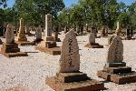 | Mi. 28.5.08 Broome Sightseeing, Cachen und Packen Beim Frühstücken sehen wir ein Känguru am Rande des Campingplatzes. Später besichtigen wir die verschiedenen Friedhöfe, die durch die unterschiedlichen Kulturkreise recht interessant sind und das Museum, das die Geschichte der Perlenfischerei anschaulich erläutert. Klären dann beim Autovermieter einige Formalitäten für den Wagenwechsel am nächsten Tag und weiter geht’s zum Hafen inklusive eines kurzen Spaziergang am Pier. Wir wollen dann zum Gatheaume Point, aber da die Piste ist nicht asphaltiert ist, machen wir das lieber morgen mit dem Allradcamper. Außerdem müssen wir ja noch die Koffer packen bevor es dunkel wird, also fahren wir zurück zum Camp am Cable Beach. Eine gute Entscheidung, denn das Packen dauert doch länger als erhofft, sodass wir den Sonnenuntergang am Cable Beach in den Wind schreiben.
