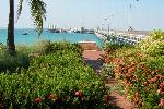 | Di. 27.5.08 Broome Sightseeing Wir verpassen den Sonnenaufgang und fahren nach dem Frühstück wieder zum Visitor Centre. Hier kann man gut parken und wir erkundigen uns nach einer Sunsetcruise mit einem Pearllugger, einem alten Perlentaucherboot. Die Touren starten aber erst wieder im Juni, da sind wir zu früh dran. Beim gemütlichen Stadtrundgang sehen wir in Chinatown das urige Sun Pictures Freiluftkino mit seinen Liegestühlen, viele Schmuckgallerien mit wunderschönen Perlen in den Auslagen, die Streeters Jetty und das Courthouse. Broome ist ein schöner, relaxter Ort mit vielen Palmen. Dann testen wir uns bei einer kleinen Bierprobe durch ein paar Biersorten der rustikalen Matso’s Micro Brewery. „Monsoon Blonde“ finden wir bei der Hitze am erfrischendsten. Nach der kleinen Stärkung schauen wir gegenüber bei dem Hotel vorbei, dass wir für die Rücktour gebucht haben und fahren dann zum Museum, das aber um 13:00 Uhr schließt. Werfen einen Blick auf die Route zu unserer Autovermietung, da wir ja dort übermorgen den Wagen wechseln wollen und fahren weiter zum Palm Grove Caravan Park Resort am Cable Beach. Können dort in der Rezeption noch günstig im Internet surfen. Abends gehen wir in der der „Divers Tavern“ essen – absolute Klasse, total lecker! |