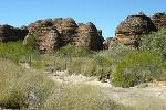 | Do. 12.6.08 In den Bungle Bungle National Park (Rock) Wir starten ohne zu tanken, denn der Sprit ist doch ganz schön teuer hier. Unser Tankinhalt reicht bestimmt noch bis Halls Creek. Wir fahren nun in den Bungle Bungle NP, denn die Strecke ist offen und gut befahrbar. Melden uns in der Ranger Station an und erfahren, dass der nördliche Teil der Bungles erst Sonnabend früh geöffnet werden soll. Wir fahren in unser vorgebuchtes Camp und sind kurz nach 13 Uhr dort. Wir wohnen hier richtig vornehm mit eigenem Bad und fließend Wasser im Zelt, sowie einem großem Doppelbett, samt Tisch und Stühlen.